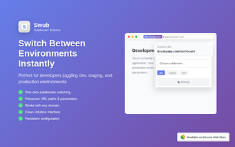 Swub - Subdomain Switcher är en praktisk tillägg för Chrome som underlättar för webbutvecklare. Denna kostnadsfria programvara låter användare snabbt växla mellan olika miljöer såsom utveckling, staging och produktion. Genom att använda Swub kan utvecklare spara tid och undvika förvirring när de arbetar med flera subdomäner. Tillägget är enkelt att installera och kräver ingen komplicerad konfiguration.